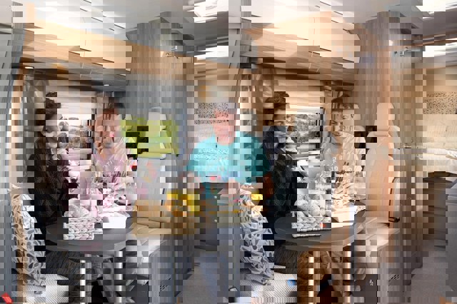 There’s plenty of lights and ventilation (plus smoke and CO2 alarms), which is handy for when you’re cooking. The hob is a mix of gas and electric while there’s enough space in the oven to cook for four. There’s even extra extendible surface space for preparing food, but you’ll need to be careful as it blocks the door and is the perfect height for a five-year-old to hit their head on.