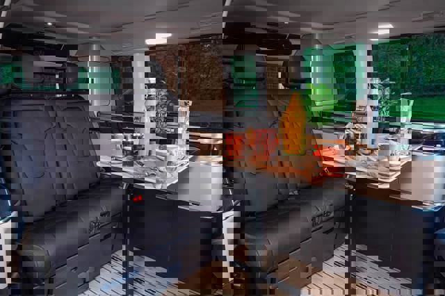 The living space can be set up in a matter of minutes, with the electronic pop-up roof and swivelling front seats taking just a few moments to organise. LED lights are scattered throughout the cabin and include coloured ambient lighting to give the interior a living room feel. Most of the windows are tinted, but if you want complete privacy then individual blinds will block out the world, while a cloth cover will obscure the windscreen and side windows.