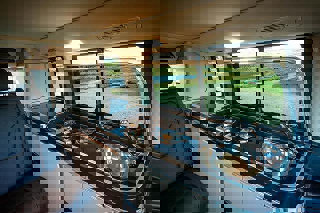 Operating the kitchen is easy, with the twin hob burner linked to a gas bottle that's situated in the boot. The fold out table, compact fridge and sink provide everything you need to store and prepare food. Running water is also supplied via a built-in water tank, which can easily be filled via an external filler cap. Waste water is collected in a separate tank that can then be emptied into a waste water tank.