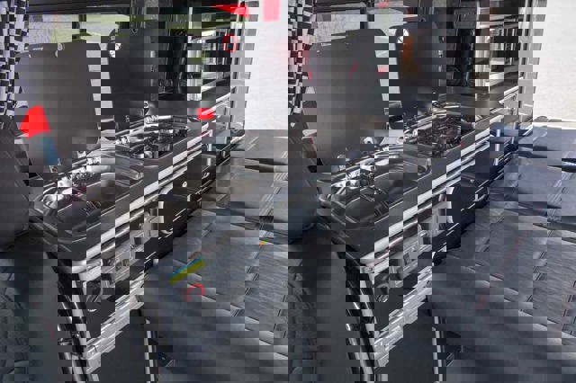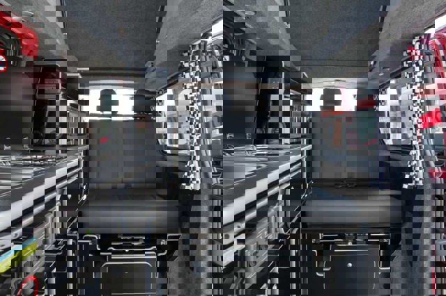 The show car was kitted out with an elevating roof section with roof bed, blackout curtaining, a non-slip floor, swivelling seats (engineered to rib and crash test specifications), an electric access step, kitchen hob and sink, microwave, wardrobe space, fridge-freezer, power sockets, TV, utility shower, “rock-and-roll” bed, portable toilet system and a dining table stowed on the tailgate for use in or outside the vehicle.