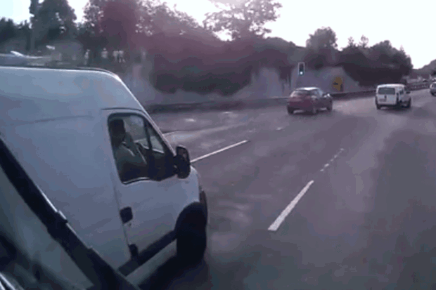 The van driver got a nasty surprise when he was presented with the footage which clearly identified him as the guilty party by his registration plate. The driver now faces six points on his licence and a £200 fine under the driver distraction laws. His insurer has also landed a big repair bill by the HGV's owner.