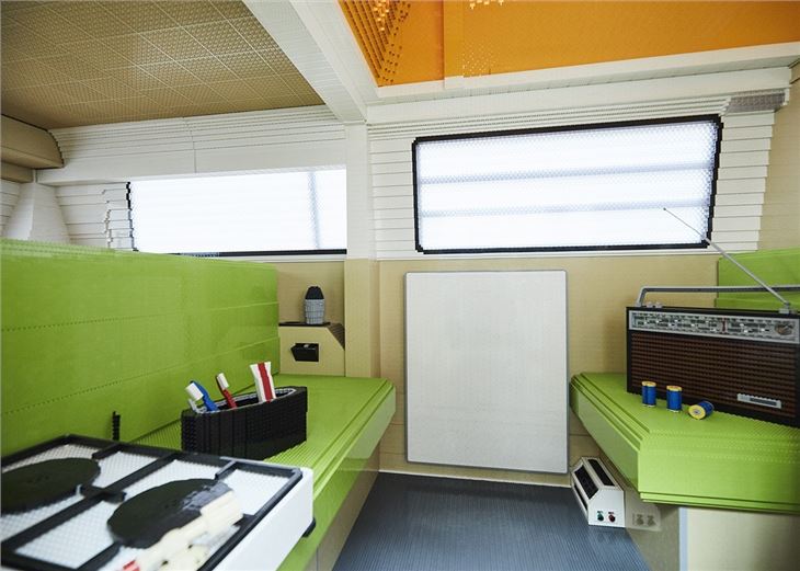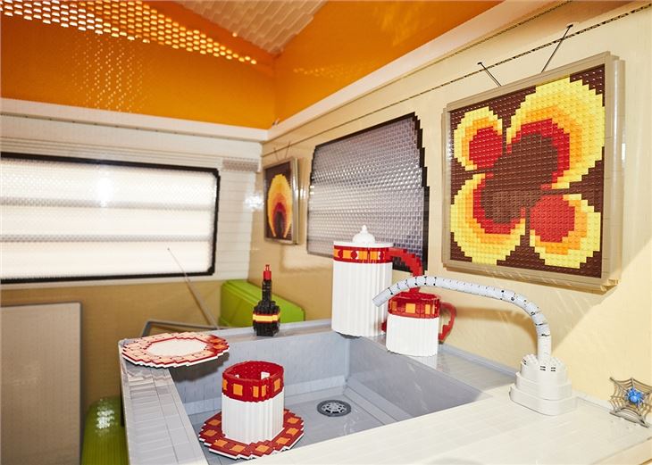 Each van matches its real-world counterpart with working headlights, indicators and brake lights. There is also a pop-up Westfalia roof and side sliding door, while the interior is furnished with Lego-built picnic tables, chairs, plates and cups. A Lego gas hob, wash sink and radio complete the retro camper look. Some 20,000 transparent bricks were used to recreate the windows.