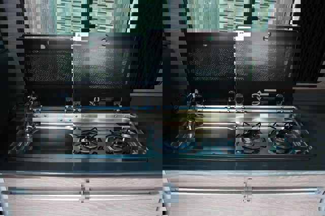 The fridge includes a small freezer compartment which is large enough to hold two days' worth of food and drinks for a family of four, while the cupboards and cabinets are sufficient in size for a frying pan, pair of saucepans and dry goods. There is also a cutlery drawer. All of the furniture is locked/unlocked with the push of a button.